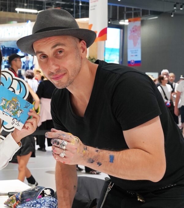その日、イタリアパビリオンで「イタリアちゃん」と「ルーチェ」2枚のライヴペインティングを行った彼の両手は、たくさんの絵の具がついたまま。とても疲れているのに一人ひとりと会話を交わし、イラスト入りのサインを描き、2ショット撮影に応じ、「疲れていてごめんね」と語りかける姿は、心底やさしい人柄を物語っていました。