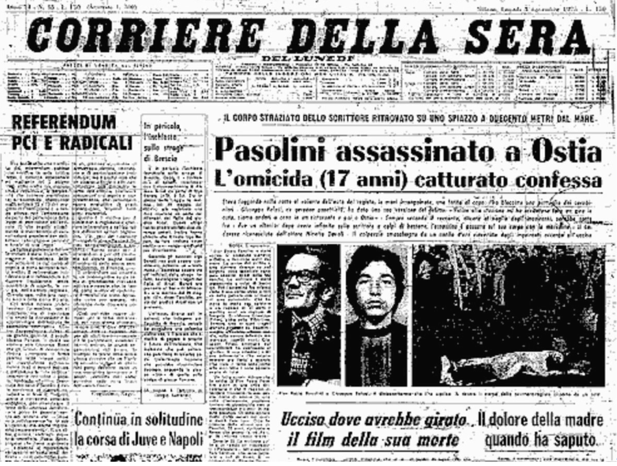 1975年11月2日、ピエロ・パオロ・パゾリーニはローマ郊外のオスティアで遺体となって発見された。文化人として知られていた彼の突然の死は、イタリア中に衝撃を与えた。犯人として逮捕されたのは当時17歳の少年ピーノ・ペロージ。彼は当初、「正当防衛だった」と主張し、パゾリーニに迫られたことへの抵抗だったと供述したが、その証言は何度も変わり、2005年には「複数の人物が関与していた」と語っている。