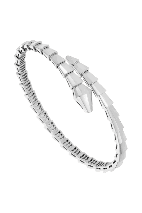 しなやかなシェイプと幾何学的な美しさが融合したデザインは、女性も男性も身につけやすいデザイン。一目でブルガリとわかる美しいウロコが手首や指に巻きつき、センシュアルな魅力を放ちます。