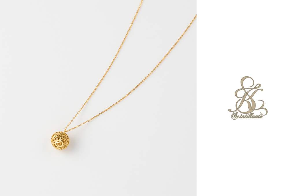 「Cestino」=「カゴ」と名付けられたネックレスは、職人の手作業で編まれた繊細な作りの球状のゴールドがキラキラと輝いて、胸元を美しく彩ってくれます。