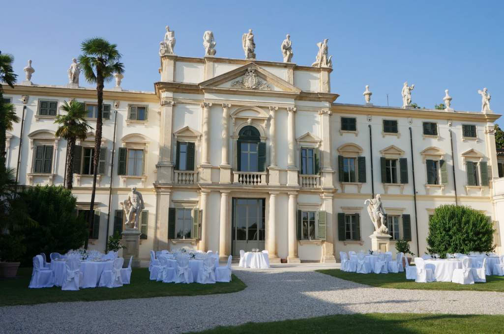 イタリアの場合、結婚式は教会または市役所で挙げますが、サンとご主人のアレッサンドロは事前に市役所で挙げました。日を変えて披露宴にはここヴィッラ・モスコーニ・ベルターニを会場に選びましたが、この日の出席者は親族や友人たち約90人ほど。