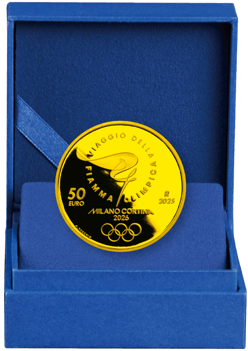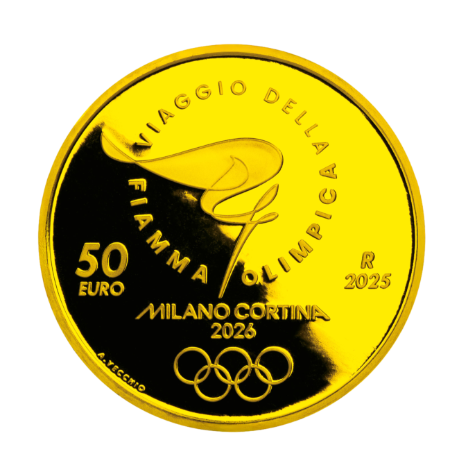 裏⾯には、オリンピックの情熱を象徴するトーチと聖⽕がゆらめく様⼦をシンプルで優美な曲線で表現した⼤会公式ルックが刻まれ、その周囲にイタリア語で「オリンピック聖⽕の旅」という言葉が添えられています。