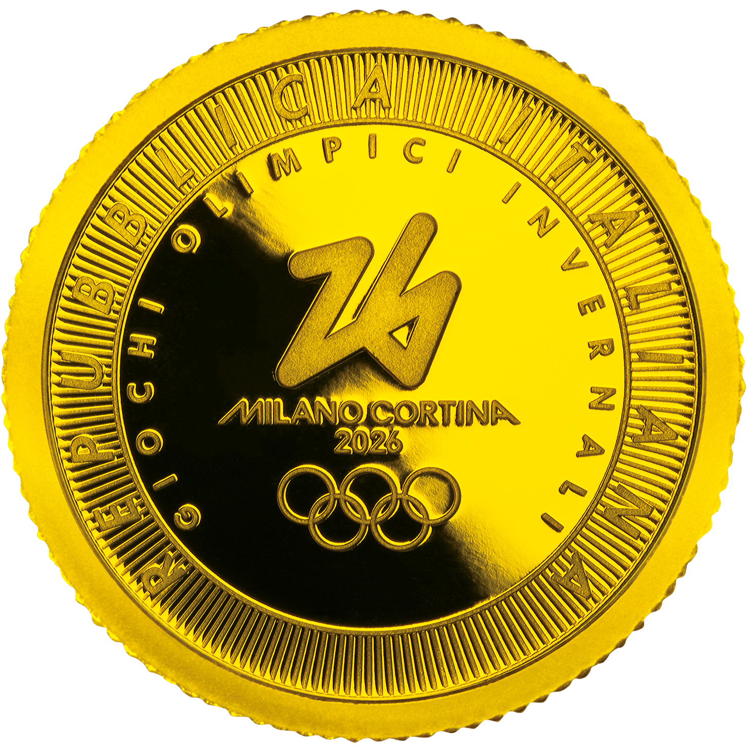 “デザインの国”イタリアらしい洗練されたデザインが光る⾦貨は、重さ1オンス(約31g)と1/4オンス(約7.8g)の2種類。史上初めてオンラインによる⼀般投票で決定された⼤会の公式エンブレム「Futura フーツラ」が⼤きく刻印され、開催年を表す数字の「26」をひと筆書き調に描いたモダンなデザインが特徴です。